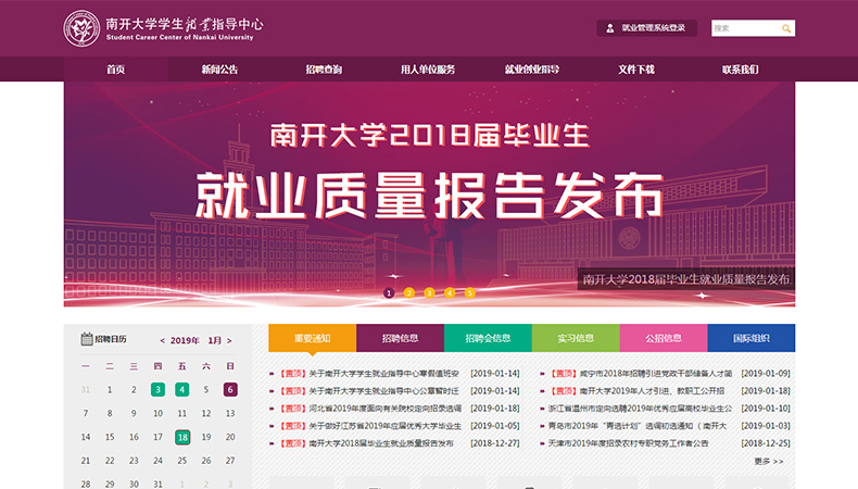南开大学学生就业指导中心成立于2000年,中心以服务毕业生和用人单位为宗旨,贯彻和执行国家有关单位就业方针政策,遵循公平、公开、公正的推荐原则,为毕业生与用人单位进行“供需见面双向选择”积极创造条件。中心代表学校对毕业生就业行使管理、指导、咨询、教育和服务的智能。为毕业生择业提供国家方针政策、就业形势、用人信息、心理准备、求职方法等方面咨询、指导与服务;收集和发布毕业生就业信息;邀请和接待用人单位来校招聘毕业生,并负责向用人单位介绍学校情况,协助用人单位组织、安排招聘洽谈活动。编制毕业生就业方案。